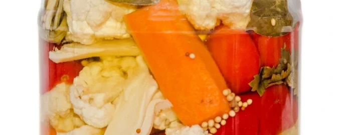 - Az üveg aljára rétegesen helyezzük a sárgarépát, a fokhagymát, a karfiolt, a paprikát, majd a sárgarépát, a karfiolt és a fokhagymát.